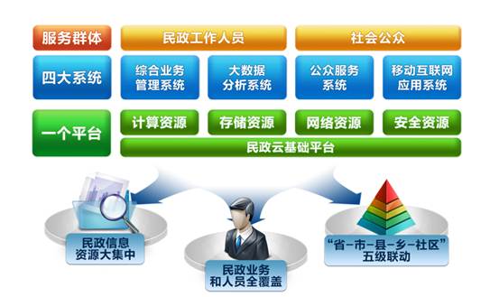 “一个平台”,即民政基础云平台。“四大系统”,即综合业务管理系统、公众服务系统、移动互联网应用系统、大数据分析系统。