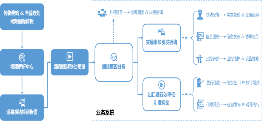 通过对高速公路沿线的视频数据进行AI解析,实现道路拥堵检测预警,并联动调取前后视频监控数据,查看交通拥堵长度和拥堵程度,并将拥堵告警信息推送至业务系统,业务系统向领导推送拥堵预警信息,并通过信息发布提供便民化服务,经公众号或前端信息发布屏发布道路拥堵信息和位置,提醒出行人员注意绕行或减速,通过大数据碰撞,根据拥堵原因触发不同拥堵处置预案: