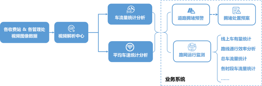 通过对各路段视频数据进行解析,实现车流量、各断面平均通行速度、车密度的分析和统计。当车流量、平均通行速度、车密度到达一定阈值时,进行道路拥堵趋势预警,并联动启动拥堵处置预案;通过对汇聚的各路段沿线视频监控数据进行AI分析,获取各路段车辆所有量、各监控断面车流量、各断面车辆通行速度,对省辖区路网运行状况进行监测,并通过业务系统可视化展现整体高速公路网的交通态势和各路段的交通通行状况。