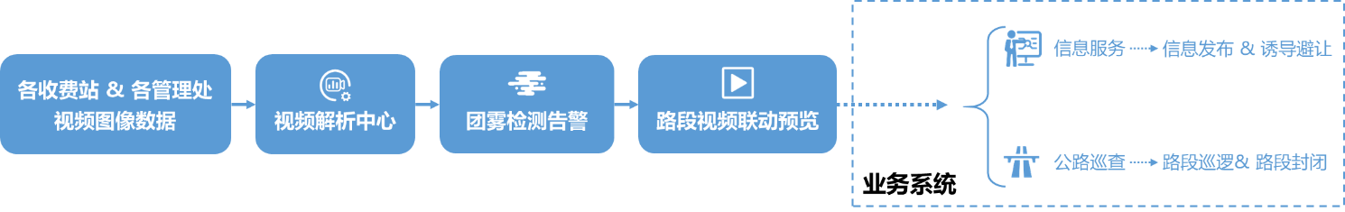 视频联网云平台通过对路段视频数据进行气象事件解析及告警提示,同时联动相邻路段视频调阅预览,分析气象覆盖距离,将预警信息推送至业务系统中。业务系统启动恶劣气象应急处置预案: