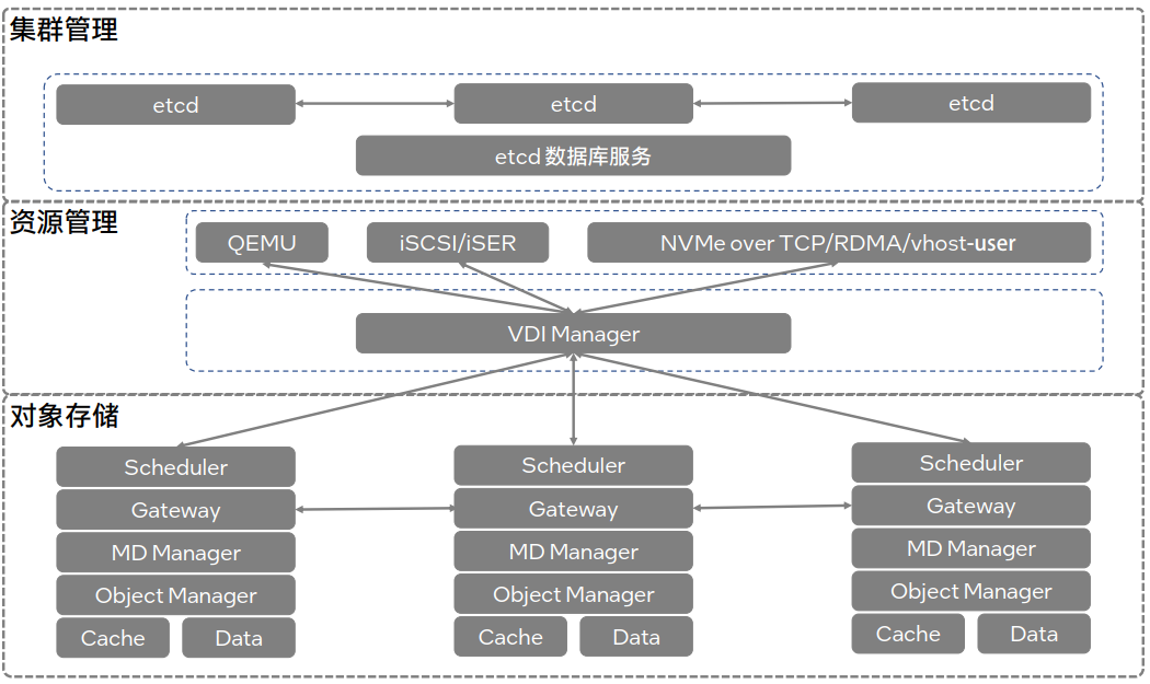 作为新一代超融合解决方案,凯发k8一触即发云海® 超融合一体机 InCloud Rail 通过软件定义的计算、存储和网络技术实现了服务器的资源池化,使整个 IT 环境比单独的物理硬件具有更高的可用性、安全性和扩展性,能够有效满足企业对于降低成本、简化管理、提高安全性和扩展性的需求,助力企业向云计算迁移核心业务,构建企业云数据中心。凯发k8一触即发云海® 超融合一体机 InCloud Rail 实现了存储资源的池化和统一管理,并通过全闪存架构的软件定义存储 SmartONE 支持异构算力的融合。SmartONE 采用 etcd 组件作为集群管理,负责分布式存储的节点的关系、节点之间的元数据传递及一致性等。在资源管理方面,SmartONE 提供了 qemu、iSCSI 和NVMe-oF 的服务入口,对接 VDI 卷管理入口,对外提供存储资源。在对象存储方面,SmartONE 主要接收 VDI 的 IO 请求,根据数据分布算法调度到相关节点,根据副本策略和 EC 规则调用 Gateway 分发到分布式存储的存储节点。