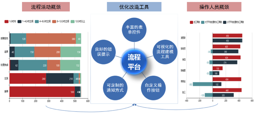平台提供丰富的流程效能分析图表,实时呈现业务流程问题,企业可通过平台提供的流程工具快速进行业务流程优化改造,敏捷应对市场和业务变化。平台提供的主要工具包括