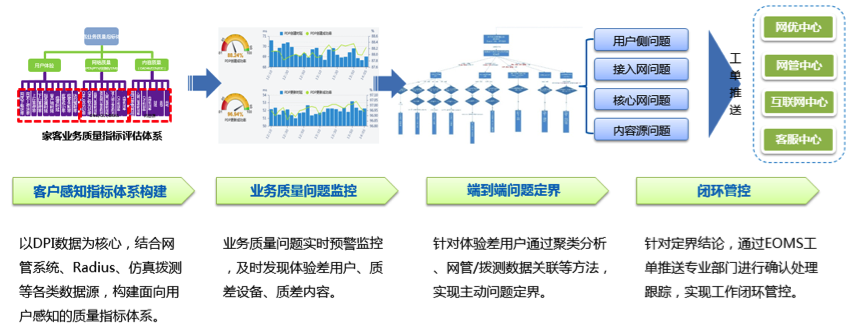 面向用户体验、网络质量、内容质量,建立家客业务质量指标评估体系,固化端到端问题定界规则。打造家客业务质量闭环管理体系,通过IT化流程实现家客业务质量管理闭环与效果评估 。