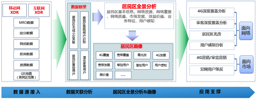基于移动网/互联网DPI数据、MR数据、经分数据、资管数据、网优及投诉等数据,从居民区及用户维度开展分析,为4G深度覆盖规划、家宽/4G套餐精确营销、异网用户策反、带宽提升或光改提供支撑建议。
